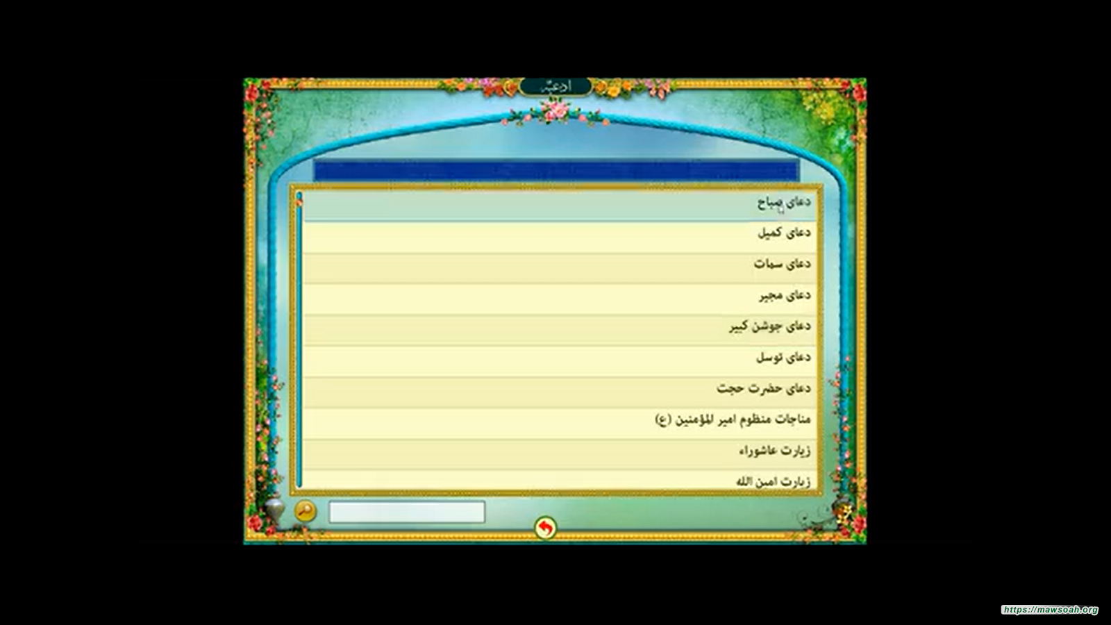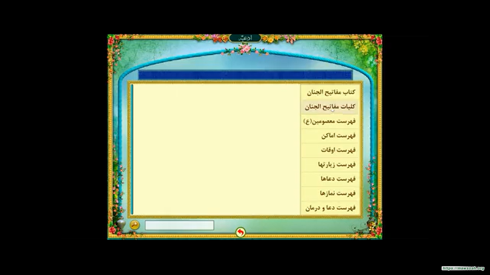 نمایش ادعیه در قالب فهرست های گوناگون از قبیل :  فهرست کتاب مفاتیح الجنان، فهرست کلیات مفاتیح الجنان – فهرست اماکن – فهرست اوقات – فهرست معصومین  – فهرست زیارتها  – فهرست دعاها  – فهرست نمازها  – فهرست اعمال روزها و ماه های سال